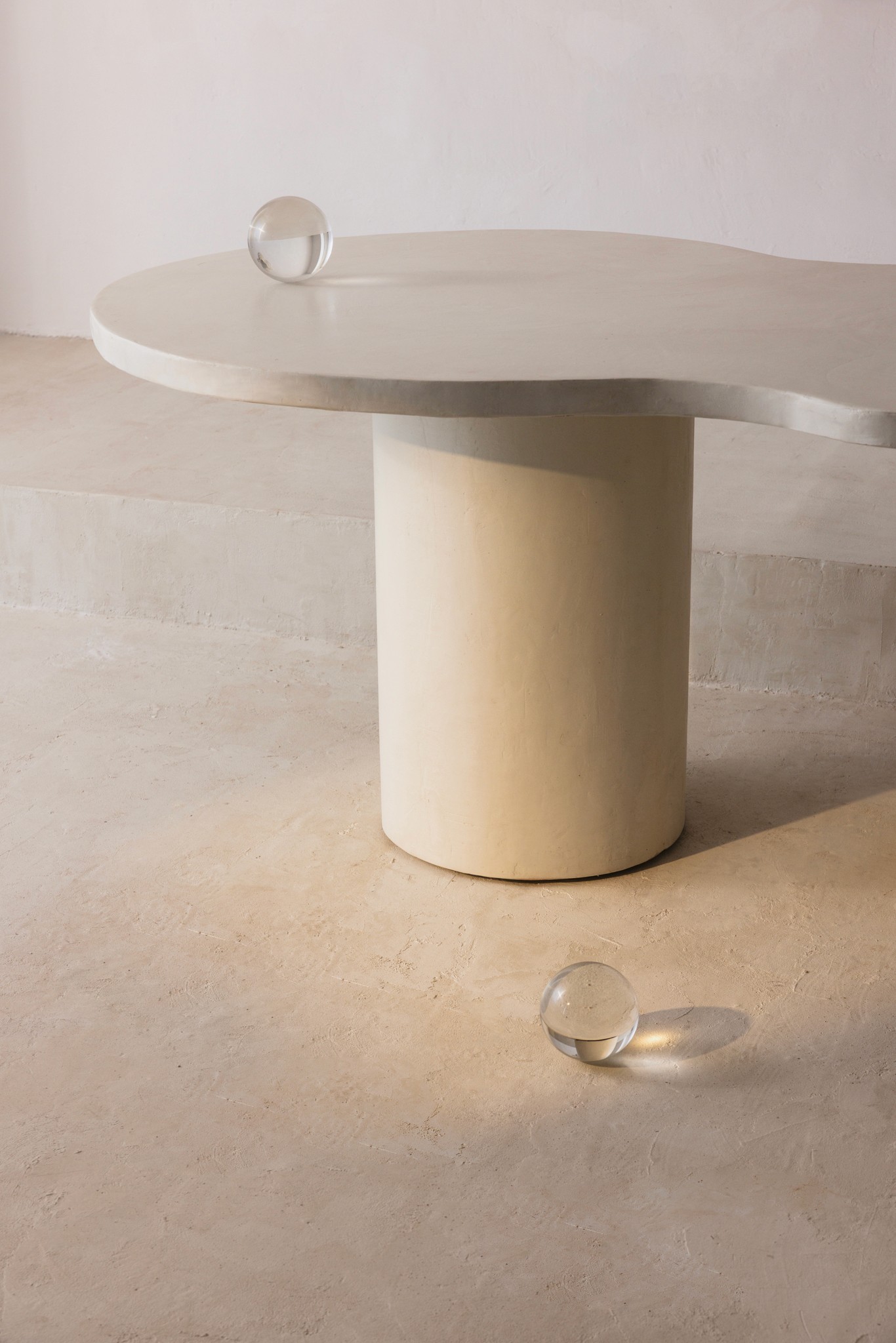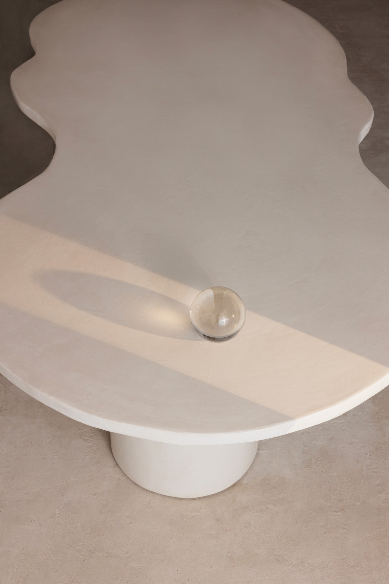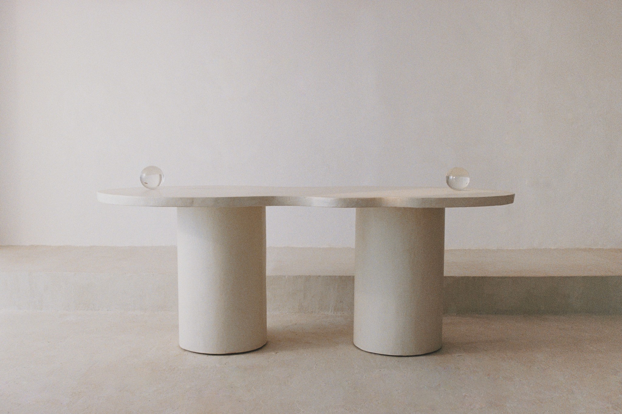 Curvae Table is a handcrafted Micro Cement dining table. The organic top of the table is supported by two cylindrical column legs, combining stability and minimalism.